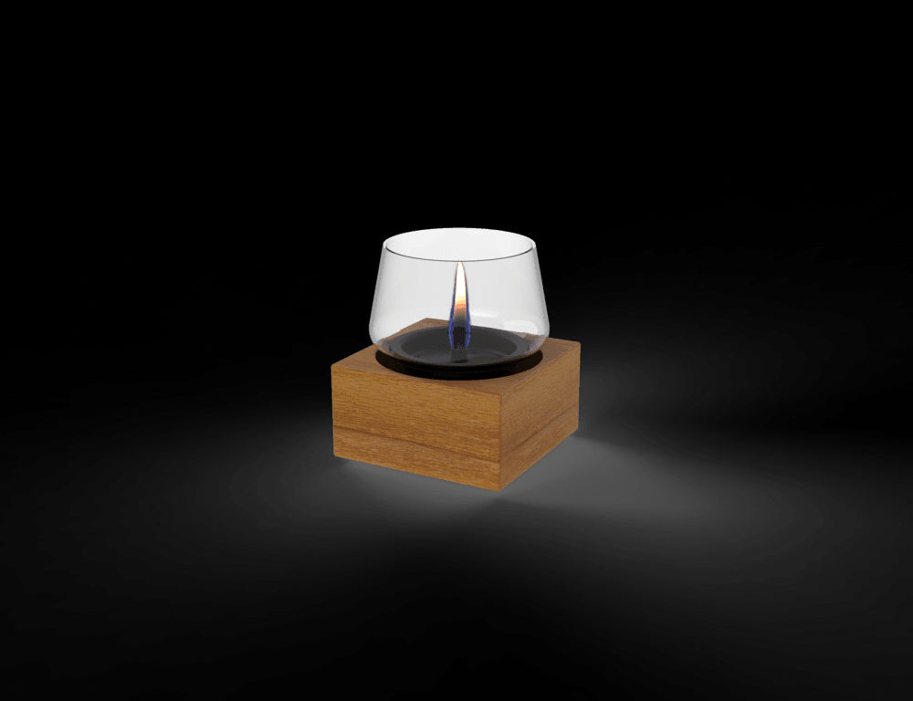 Gemaakt van puur gecertificeerd eikenhout en voorzien van één lont die een zachte, kaarsachtige vlam creëert.